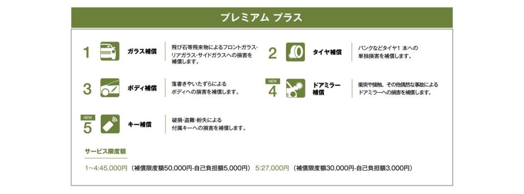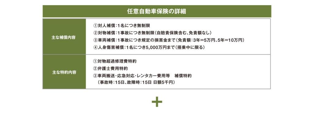 「Jeep First Ride」には、年令や等級を問わない、任意自動車保険がセット!対人・対物・人身傷害の補償はもちろん、車両保険や万一の際の弁護士費用まで安心の補償をご提供します。さらに、ボディやガラス、タイヤまで補償する充実のプレミアムプラスもセット!