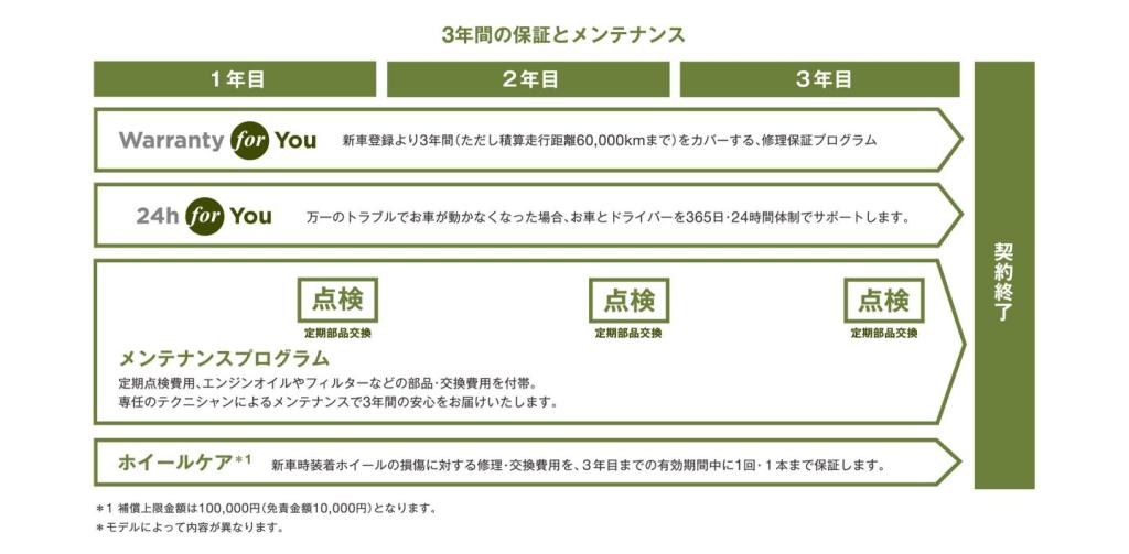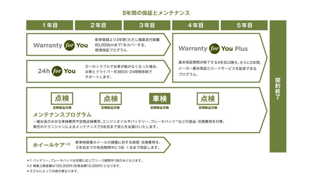 法定点検や車検、メンテナンスやロードサービスも付帯。専門のスタッフが、万全の体制でサポートします。こんなに安心!保証とメンテナンスもすべてコミコミ!